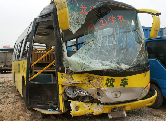 出事校車屬于平湖街道龍湖學校,車牌號為粵B 89513,核載人數(shù)為45人。昨天上午9時許,南都記者在布吉扣車場看到,校車車頭擋風玻璃幾乎完全撞爛,車門玻璃也已經爛掉,歪倒在一邊無法打開。
