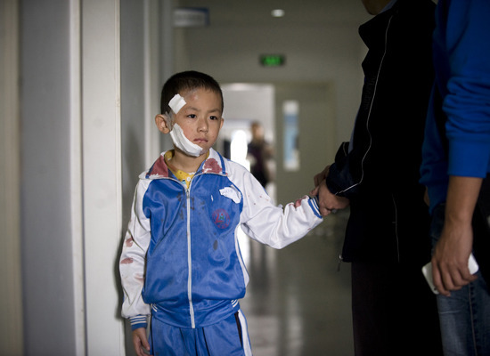 10時許,記者趕到深圳第三人民醫(yī)院急診外科,很多學生正在排隊等候。6歲半的鄭榮祺傷得比較嚴重,校服上有多處血跡,眼角和臉部都被劃傷,縫了幾針,眼角帶著淚水,眼神中還有點恐慌。5歲小女孩萬湘?zhèn)米钪?。剛剛做完檢查后,她閉眼躺在活動車上,不愿跟別人說話。