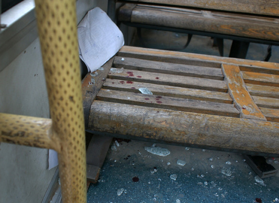 車廂內部,座位東倒西歪,多個座位可見血跡,地板上散落著未及吃完的油條包子等早餐。兩張寫有乘車學生名字和聯(lián)系電話的名單散落在車頭座位旁。名單顯示,大部分學生住在布吉甘坑村和里湖花園附近。
