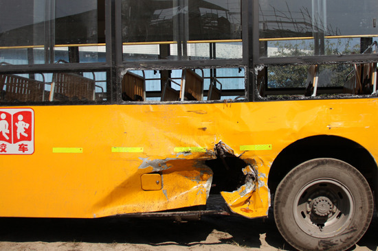 校車左后車輪前被撞臉盆大凹痕,四扇玻璃被撞碎