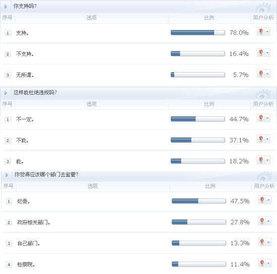 【調(diào)查顯示】在你是否支持的問題上,78%的網(wǎng)友表示支持,16.4%的網(wǎng)友表示不支持,5.7%的網(wǎng)友表示無所謂;在這樣是否能杜絕違規(guī)的問題上,44.7%的網(wǎng)友表示不一定,37.1%的網(wǎng)友表示不能,僅18.2%的網(wǎng)友表示能;在你覺得應(yīng)該哪個(gè)部門去監(jiān)管的問題上,47.5%的網(wǎng)友選了紀(jì)委,27.8%的網(wǎng)友選相關(guān)部門,13.3%的網(wǎng)友選自己部門,11.4%的網(wǎng)友選檢察院