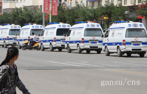 甘肅省慶陽市緊急醫(yī)療救援環(huán)縣分中心17輛安上了GPS定位系統(tǒng)的救護(hù)車上街宣傳。張永鑫 攝