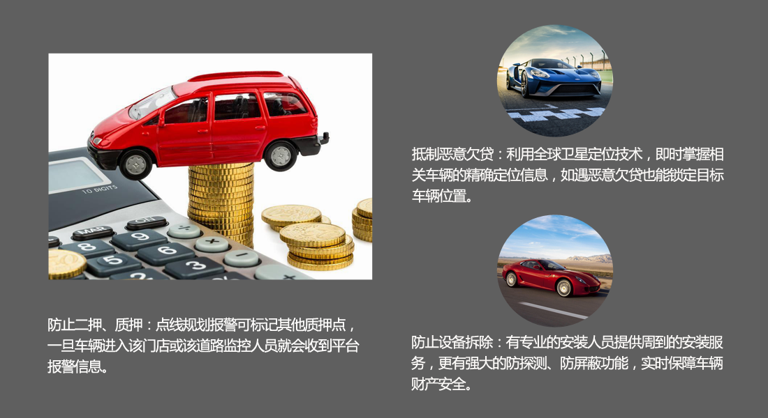車貸、擔(dān)保、銀行按揭、抵押車、租賃公司遭遇騙租、變現(xiàn)、異地抵押,拆除車輛安裝的GPS后,進(jìn)行非法車輛買賣,導(dǎo)致車輛無法監(jiān)控,給找車帶來了重重困難。無線GPS,無需接線、更隱蔽。為租賃、信貸、按揭、分期、抵押車提供專業(yè)打造的車輛安全GPS解決方案和產(chǎn)品。