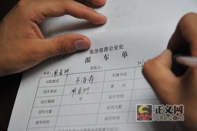 圖1、7月16日,山西臨汾鐵路公安處聞喜火車站派出所警車司機在展示警車出車派車單?!?/P>