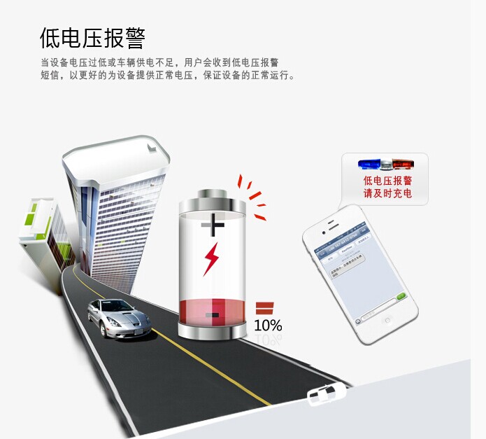 9、低電報(bào)警設(shè)計(jì),及時(shí)提醒避免電壓過低導(dǎo)致無法定位,保證車輛為設(shè)備提供正常的電量。