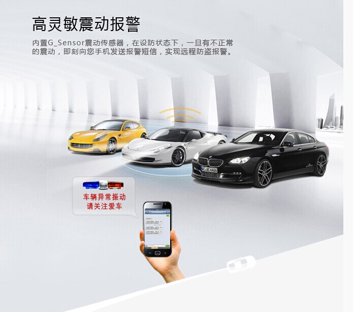 10、車輛在受到震動(dòng)的情況下,如、拖車、砸玻璃、碰撞、偷輪胎設(shè)備就會(huì)通過手機(jī)第一時(shí)間通知到車主。