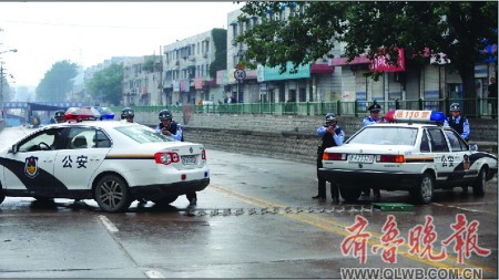 見示意停車無效,根據(jù)犯罪嫌疑人逃竄的路線,槐蔭巡警大隊(duì)的民警在經(jīng)一緯十二路路口,布置了兩輛巡邏車,并在馬路中間放置了阻車器,以攔截被搶車輛。
