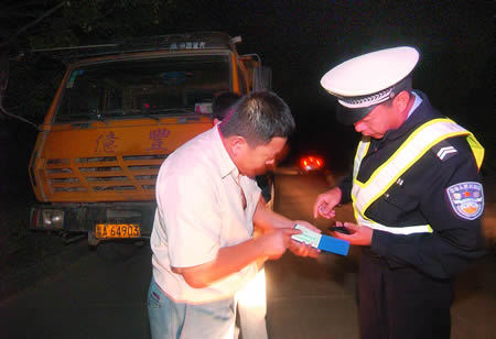 前晚的行動持續(xù)了2個多小時,到晚上11點(diǎn)半左右結(jié)束。記者在行動中發(fā)現(xiàn),絕大部分的泥頭車都證件齊全,而且按照規(guī)定行駛。不過在昨晚的行動中卻發(fā)生了令人哭笑不得的一幕:執(zhí)法隊(duì)伍在同泰路某小區(qū)門口截?fù)魴z查一輛泥頭車的時候,遠(yuǎn)處駛來的2輛泥頭車看到執(zhí)法部門正在檢查,立即轉(zhuǎn)入一條小路,把車停在路邊并且熄火熄燈,司機(jī)也躲在駕駛艙內(nèi)不敢露臉。后來在交警部門的努力下,司機(jī)終于打開車門接受檢查,而在檢查過程中卻沒有發(fā)現(xiàn)任何問題。