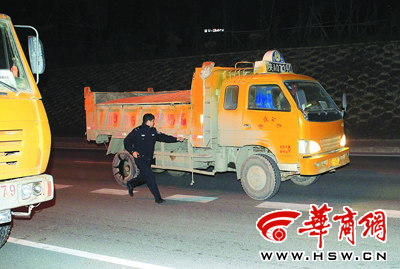昨晚10時(shí)6分,在曲江檢查點(diǎn),渣土車司機(jī)沒有停車的意思,西安市交警支隊(duì)特勤大隊(duì)大隊(duì)長馬岳鋒箭步上前,大喝停車,司機(jī)最終將車停在路邊 本報(bào)記者湯繼穎攝
